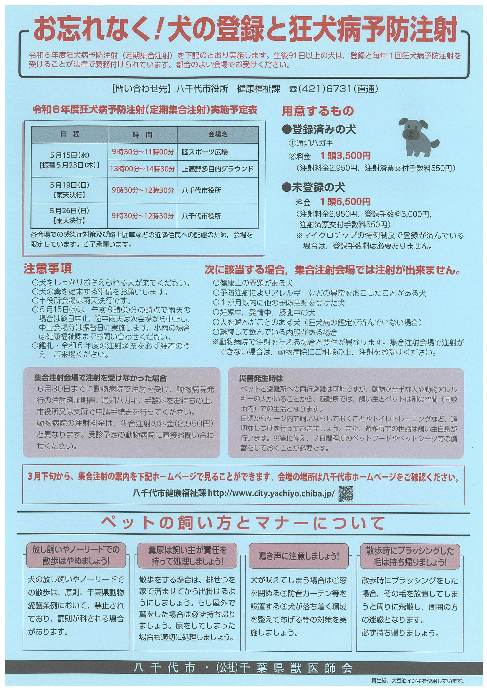 犬の登録と狂犬病予防注射 2024年4月26日2024年4月26日 自治会回覧 令和6年度狂犬病予防注射(定期集合注射)を実施します。生後91日以上の犬は、登録と毎年1回狂犬病予防注射を受けることが法律で義務付けられています。都合のよい会場でお受けください。